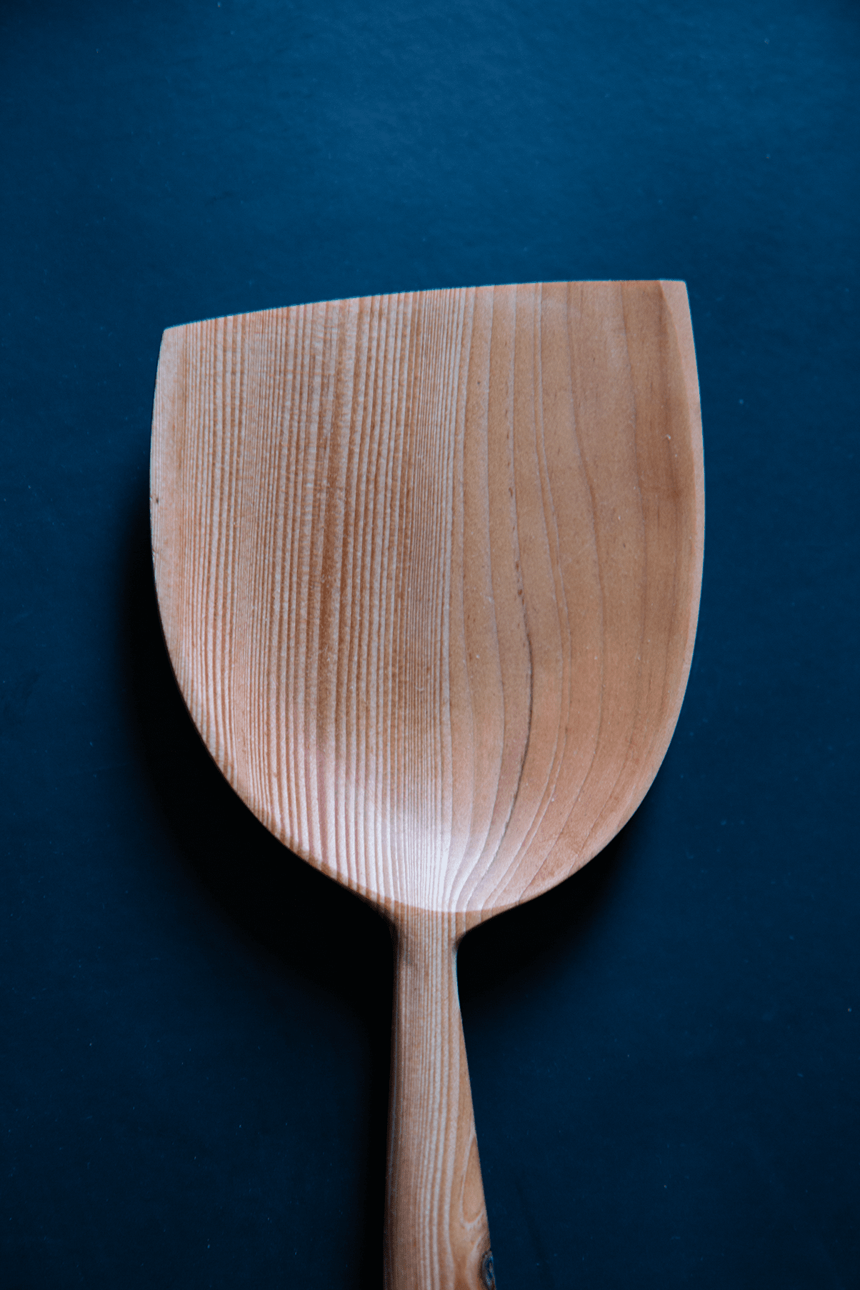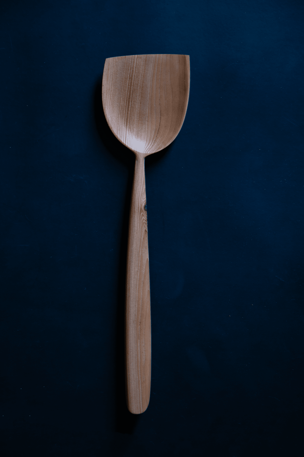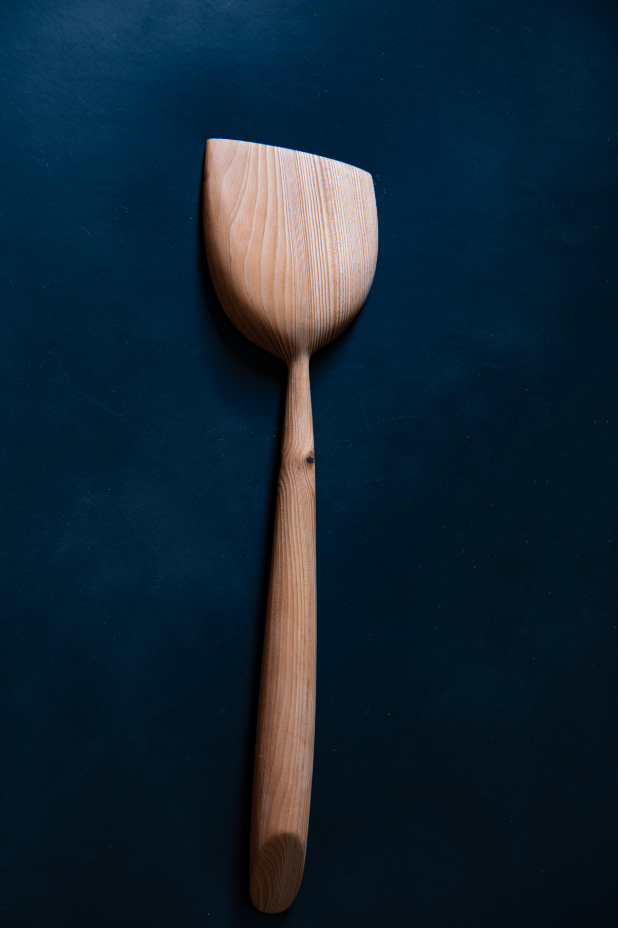 scoop spatula carved from old growth douglas fir grown in the islands of the american san juans in washington, featuring a beauty knothole. finished with foodsafe polyurethane. 10 inches long